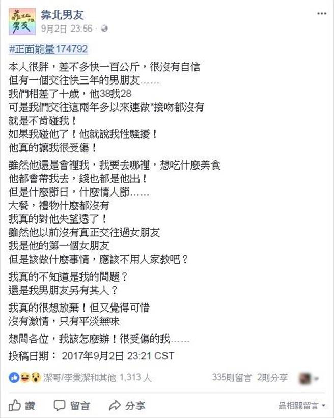 一名自称很胖、体重接近100公斤、没有自信的女网友在Facebook抱怨男友,表示与男友交往快满3年,男方对她很好、很温柔。