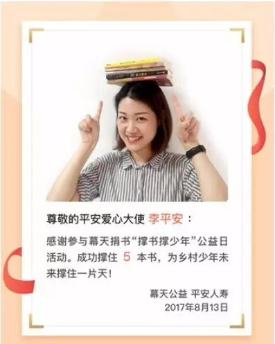今年9月始,平安人寿以“撑”为话题,在报纸、微博、微信等平台上,打响了一轮公益战役——幕天捐书“撑书撑少年”公益行动,号召人们关注教育公益。同时,平安金管家APP同步上线了“撑书撑少年”公益行动,登录APP上传个人头顶撑书图片即可参与挑战。