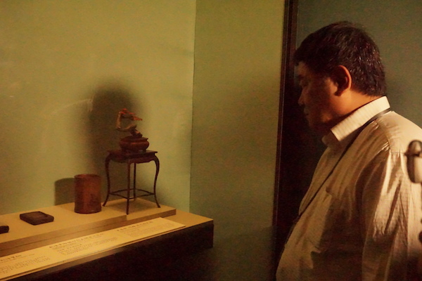 在观展中,“澎湃新闻·古代艺术”记者在现场偶遇单霁翔院长,他告诉澎湃新闻,这次的赵孟頫展,故宫除了拿出来珍贵的书画作品,还拿出来一些小盆景、小桌子、小椅子、笔筒、插屏等,以显现文人气韵。