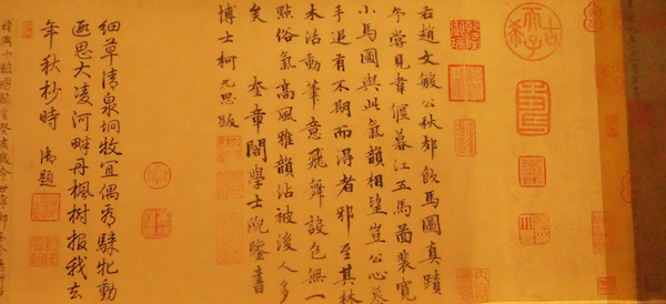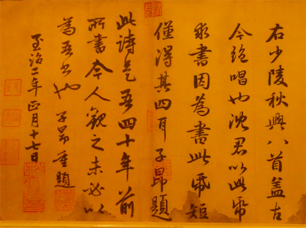 第一展区除了《行书秋兴诗卷》以外,主要展出的是赵孟頫同时代的或者前代人作品流传到他手里,他写的题跋。