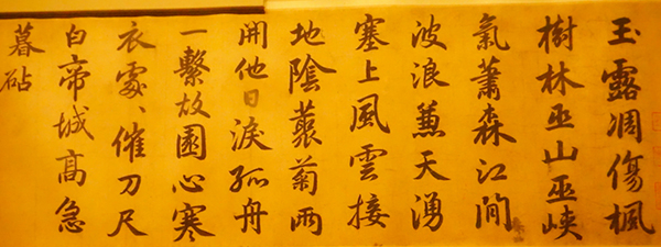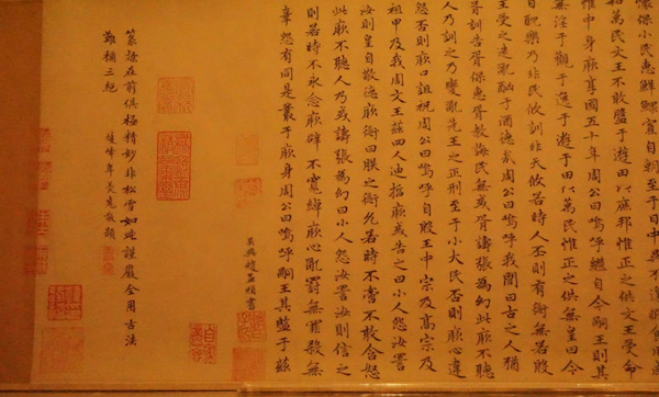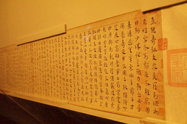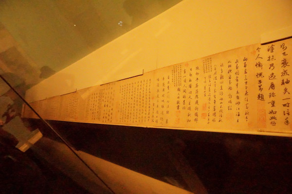 整个武英殿的展区分布大致是一个“工”字形状,有四个长方形的展区,中间有一个过道,过道的两边也有展柜。图片中就是通往后面两个展区的过道,青色的墙体上写着后人对于赵孟頫的评价以及赵孟頫一生的行迹。