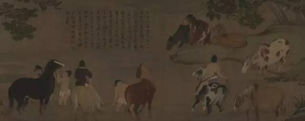 本图结合青绿与浅绛两种画法,色彩丰富,清丽雅致兼得,布局错落有致,马匹与人物的姿态相互呼应。树干的皴法、坡石的勾勒简练古朴。人物衣纹流畅,颜色的罩染做到了色不掩墨,肯定并卷突出了线条在绘画中的地位。