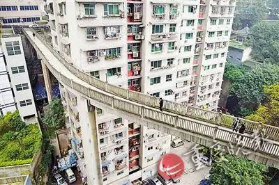 重庆南岸区聚丰江山里小区的观光走廊,路下面就是房屋顶楼。