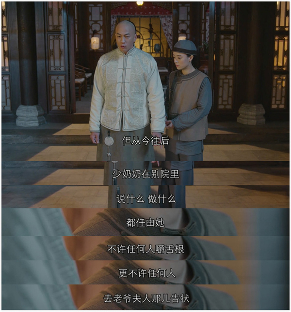 面对周莹吴聘就是“宠妻狂魔”,但如果旁人作了什么不利于周莹的事,吴聘毫不心慈手软,严令禁止下人嚼舌根告状,不然立刻撵出去,树立少奶奶的威严。