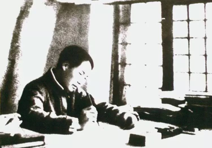 1938年5月,毛泽东发表《抗日游击战争的战略问题》和《论持久战》,确定了抗日战争的战略方针。图为毛泽东在延安窑洞撰写《论持久战》。