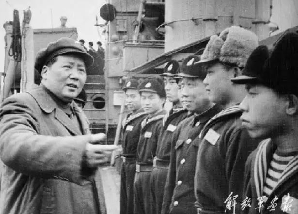 1953年2月19日,毛主席在武汉汉江关码头登上“洛阳”舰视察,并和该舰官兵一起航行。(解放军画报)