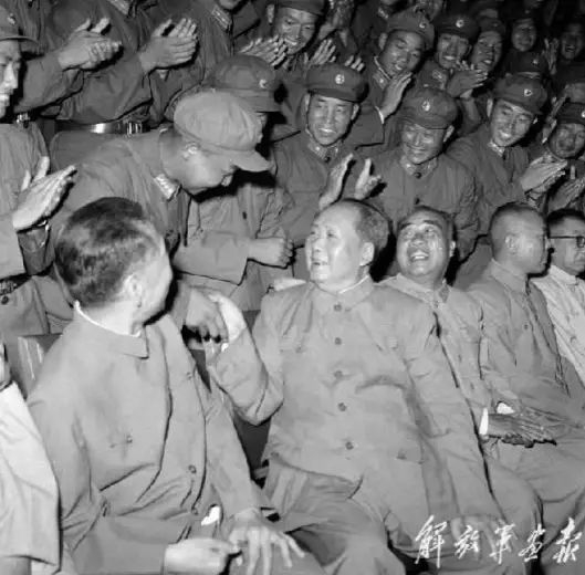 1964年,毛泽东、周恩来、刘少奇、邓小平和解放军官兵在一起。