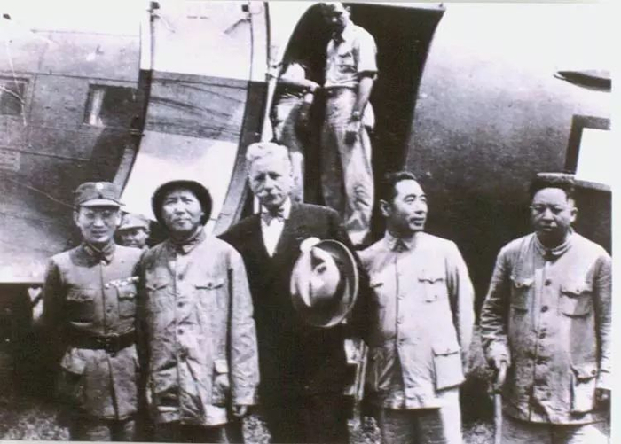 1945年8月,中共代表毛泽东、周恩来、王若飞应蒋介石的邀请,赴重庆同国民党谈判。图为中共代表离开延安前,与专程前来迎接的美国驻华大使赫尔利(中)、国民党代表张治中合影。