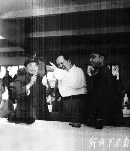 1964年,毛泽东同志在全军比武大会上,用神枪手使用过的枪支瞄准。(解放军画报)