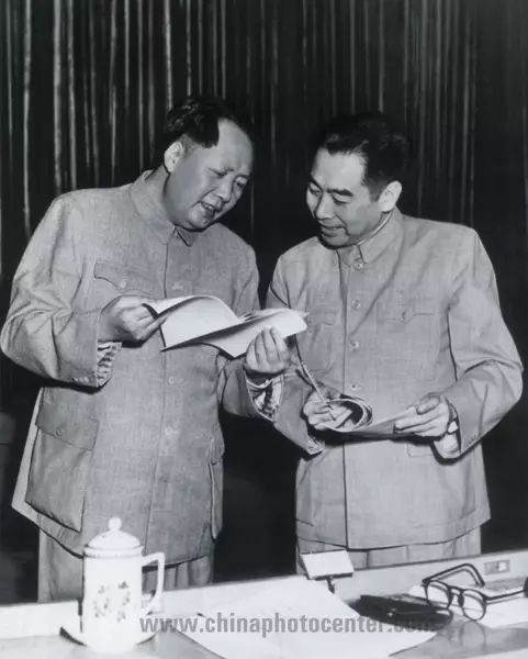 1953年,毛泽东和周恩来在中南海怀仁堂。