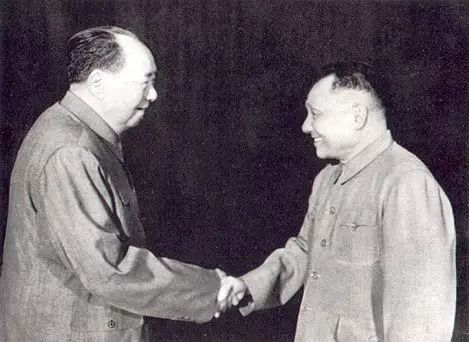 1974年底,毛泽东主席与邓小平同志亲切握手。