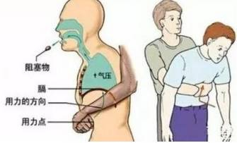 抢救者站在病人背后,用两手臂环绕病人的腰部,然后一手握拳,将拳头的拇指一侧放在病人胸廓下河脐上的腹部。再用另一手抓住拳头、快速向上重击压迫病人的腹部。重复以上手法直到异物排出。