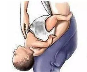 救护人应该马上把孩子抱起来,一只手捏住孩子颧骨两侧,手臂贴着孩子的前胸,另一只手托住孩子后颈部,让其脸朝下,趴在救护人膝盖上。在孩子背上拍1-5次,并观察孩子是否将异物吐出。