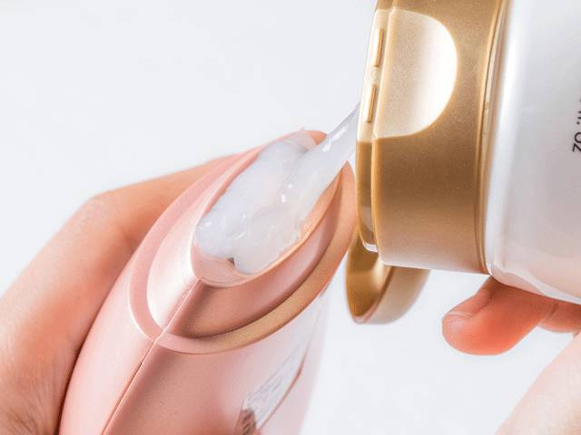 第六步:以画圈的方式,在涂抹好凝胶的部位不断移动。美容仪的电极部分会开始发热。当它识别到肌肤的真皮层已达到52℃左右的最佳温度,闪烁的指示灯会从蓝色变为绿色。