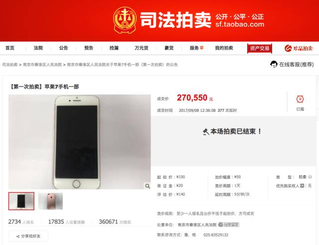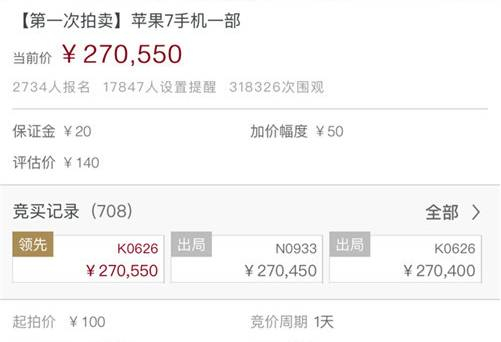 起拍价100元,估价140元的二手苹果7手机,最终竟然以27万余元的“天价”成交。在昨天的一次网络司法拍卖中,这样一个拍品出现了。