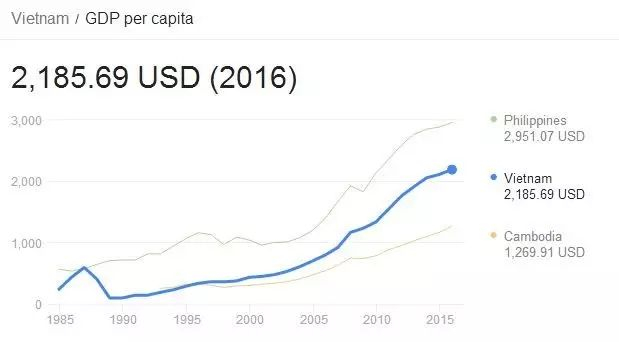 根据世界银行的数据,2016年越南人均GDP约2185美元,只相当于中国的四分之一。越南的土地、劳动力资源便宜,制造业对外“招商引资”才开始不久,这一切都和二三十年前的中国有点像。