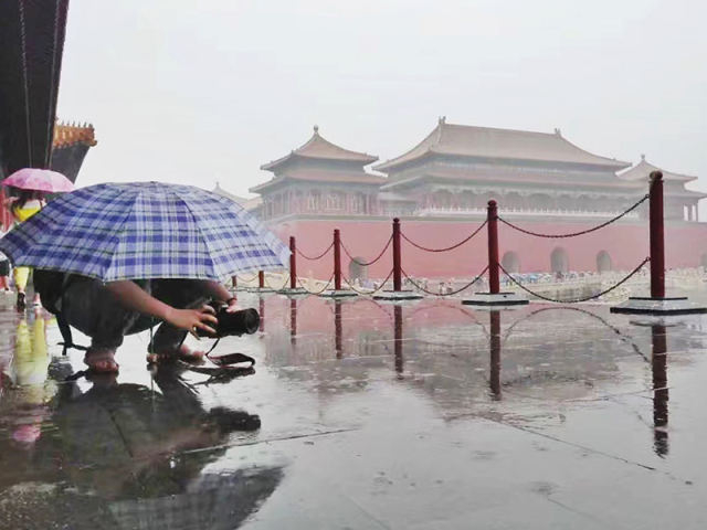 为了拍到雨中故宫没有人的画面,这个瘦弱的姑娘在瓢泼大雨中等了足足五个半小时。“蹲在那里,每等到一拨人过去的时候就赶紧按快门,或是等阵雨稍微停一点就赶紧冲出去拍几分钟。”她说,故宫的排水系统那么好,如果不是正在下雨,而等到雨完全停了再去,根本拍不到那么好的积水。