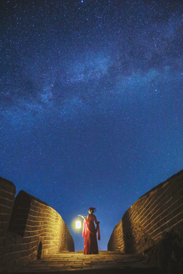 在长城上露宿两个通宵,在横跨天顶的银河拱桥下摸着黑爬上爬下,穿过一座座烽火台,把星空和汉服元素融合在了一起,用照片还原千年前古人观星的画面。 来源:新华社