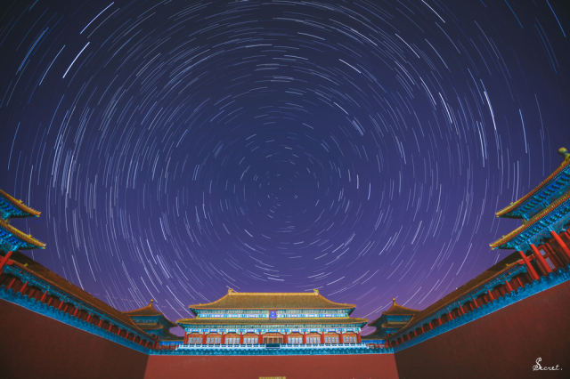 故宫的布局极讲究,处南北中轴。面向午门拍摄,可以拍到这样以北极星为圆心的同心圆星轨,更显古代皇城的神秘。她还在故宫对着午门拍出以北极星为圆心的同心圆星轨;在角楼耗时40分钟连续曝光获得“角楼的星空”。