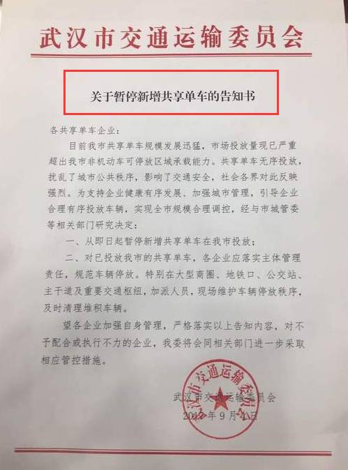 9月4 日武汉宣布,自即日起暂停投放共享单车。这是国内第 6 个暂停新增投放共享单车的城市。