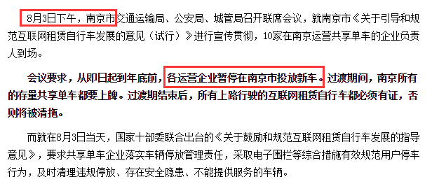 8月3日,南京市交通运输局、公安局、城管局联合发出要求,即日起至年底前为过渡期,期间各运营企业暂停投放新车,所有的存量共享单车都要上牌。