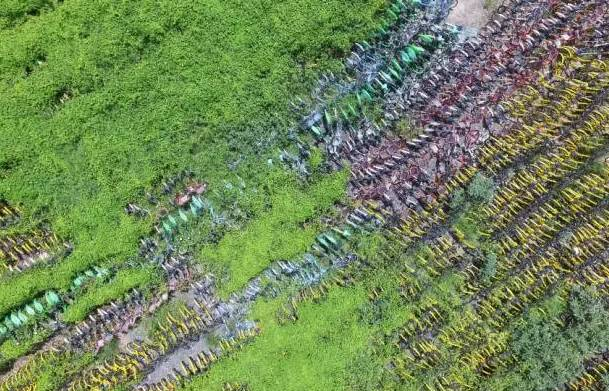 上海静安区鸿兴路中兴路的两处停车场内,近3万辆各种品牌的共享单车在场地内“堆积如山”,另外部分已被绿植覆盖,好似“长草”。