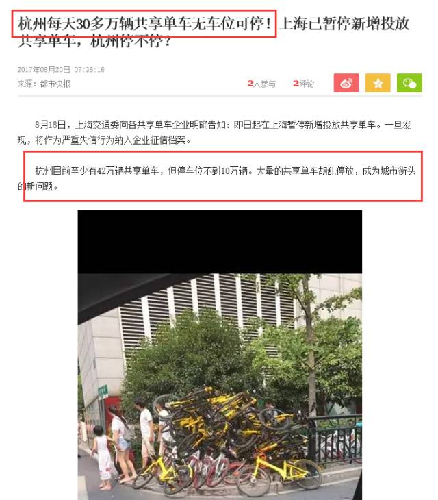 8月18日,上海交通委向各共享单车企业明确告知:即日起在上海暂停新增投放共享单车。一旦发现,将作为严重失信行为纳入企业征信档案。
