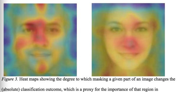 为了进一步检验“同性恋长相更不具备性别典型性”这一假设,研究者还通过一个准确率98%的性别分类器试图区别同性恋和异性恋,发现在男性身上的准确率为 57%,在女性身上的准确率为 58%。论文写到:“数据显示,男性面部的女性化程度与同性恋概率呈正相关,女性则相反。”