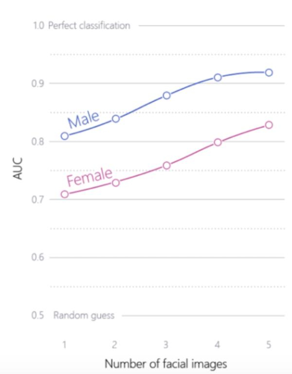 研究者使用一个名为VGG-Face的深度神经网络提取图像的特征,并以此训练逻辑回归模型。实验结果显示,给定单张面部图像,分类器能以81%的概率区别同性恋和异性恋男性,女性则为71%。给定同一个人的5张面部图像,算法的准确率可以相应提高到91%和83%。