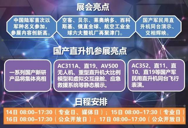 本届天津直博会将举行飞行表演6场次,将继续由陆军领衔,陆军部队在结束“八一”朱日和阅兵之后,马不停蹄地投入直博会飞行表演训练工作,表演动作将达到国际领先水平。时间表如下图: