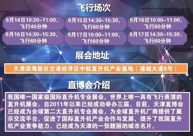 第四届中国天津国际直升机博览会将于9月14日至9月17日在空港经济区中航直升机产业基地举行,其中前两日为专业日,后两日对社会公众开放。
