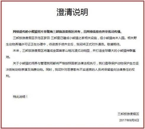 网络盛传的小熊猫照片非陇海三郎旅游度假区所有,且网络信息也并非我司传播。