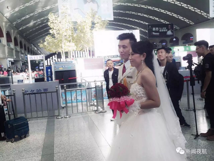 过安检、检票、上车,两位新人每一个环节,都引来周围旅客的围观。当两人新人走到站台,接亲队伍还组织了一个小小的欢迎仪式。