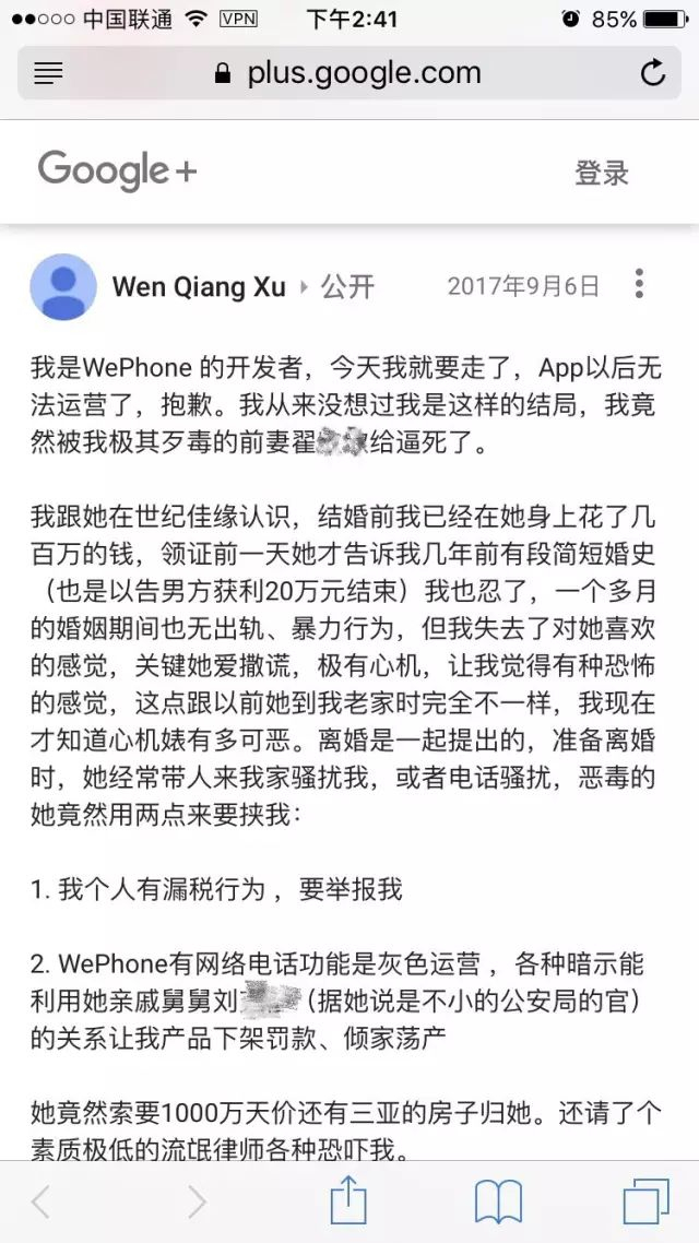 9月6日,WePhone创始人兼开发者苏享茂用Google ID Wen Qiang Xu发帖,称自己被恶毒前妻相逼,将要离开人世,WePhone以后将要停止运营等信息,并附上前妻的手机号码、工作单位。此外,苏享茂还在相册中上传自己与前妻的聊天截图,以及两人签署的离婚合约。