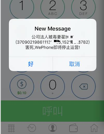 每日经济新闻(微信号:nbdnews)记者发现,截至今天(9月10日)中午,WePhone软件仍可正常下载使用,不过,在打开后软件页面弹出的对话框,“公司法人被毒妻翟某某害死,WePhone即将停止运营。”