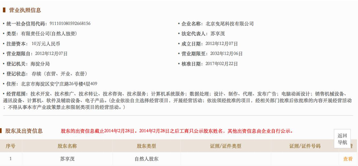 WePhone为北京曳尾科技有限公司开发的产品。每日经济新闻(微信号:nbdnews)记者在企业信用信息公示系统中发现,该公司建立于2012年12月,注册资本10万元人民币,法定代表人为苏享茂,并由其100%持股。