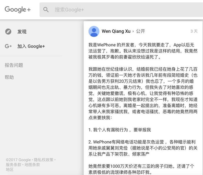 9月6日,WePhone创始人兼开发者苏享茂用Google+ ID Wen Qiang Xu发帖,称自己被前妻相逼,将要离开人世,WePhone以后将要停止运营等信息,并附上前妻的手机号码、工作单位。此外,苏享茂还在相册中上传自己与前妻的聊天截图,以及两人签署的离婚合约。