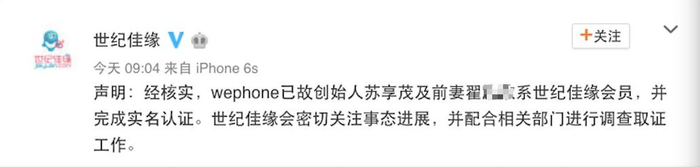 经核实,WePhone已故创始人苏享茂及前妻翟某某系世纪佳缘会员,并完成实名认证。世纪佳缘会密切关注事态进展,并配合相关部门进行调查取证工作。