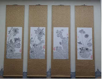 四件条屏为安吴堡吴周氏居室前的石砖雕。凤凰来仪、八哥临啭,均为传统吉祥富贵图案;红荷出泥不染,金菊凭石益贞,含有富而不浊、独立守节之寓意。(泾阳陕商文化博物馆馆藏)