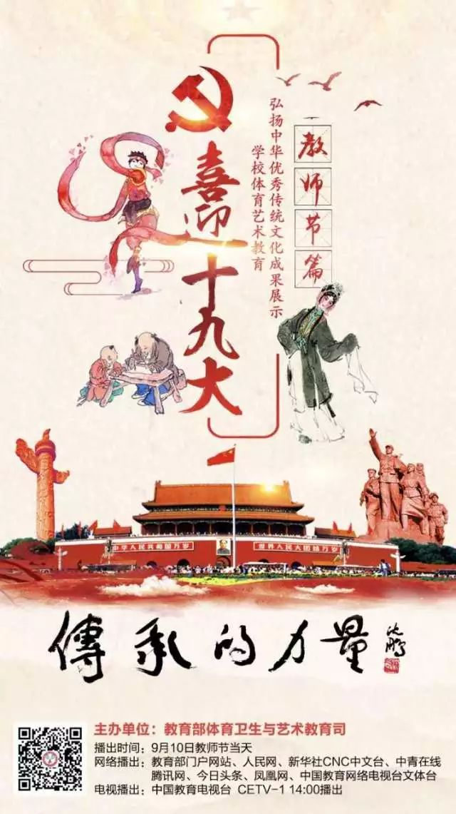为落实 《实施中华优秀传统文化传承发展工程的意见》,教育部在全国中小学的艺术、体育教育课程中开展传统文化教育,教育部体育卫生与艺术教育司出品、中国教育电视台承接制作的《传承的力量》学校体育艺术教育弘扬中华优秀传统文化成果展示视频宣传片,特推出《传承的力量》2017教师节篇。