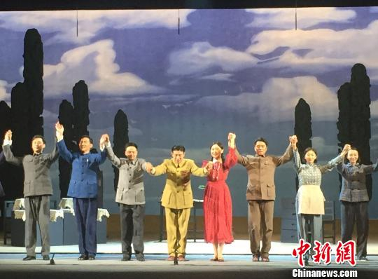 国家大剧院话剧《西望长安》于9月8日至12日在北京亦庄博纳星辉剧院连续上演5场。图为演出结束后剧组谢幕。 陈建 摄