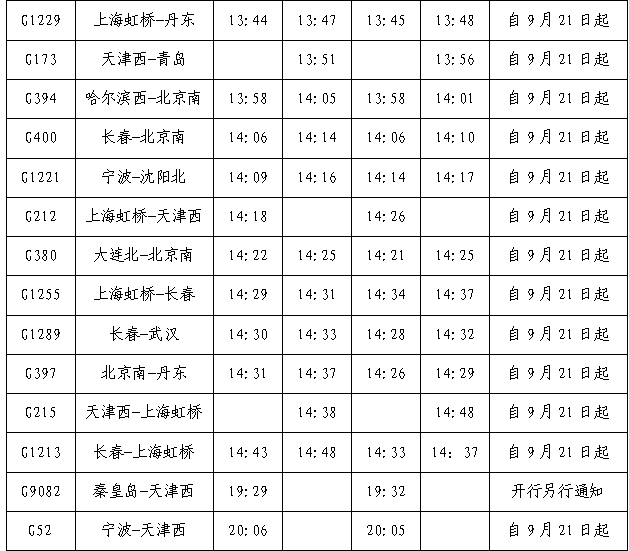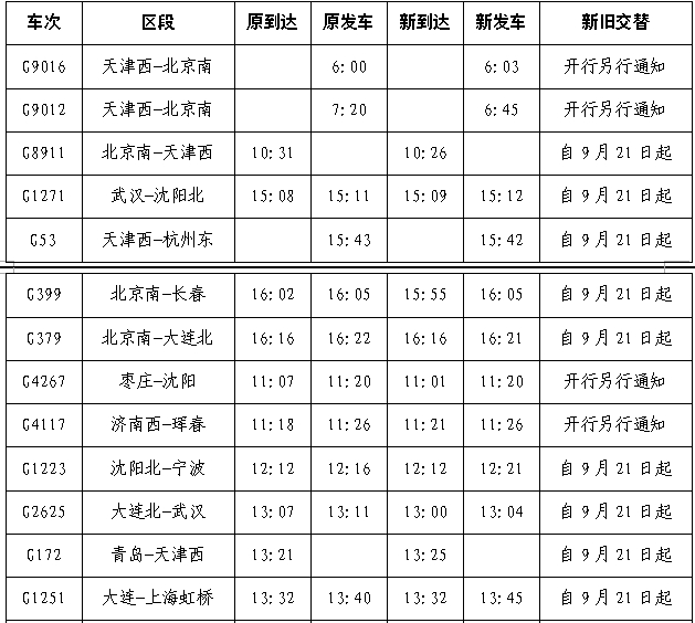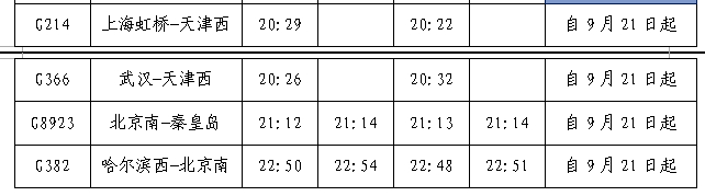 到开时刻变化31列,分别为:G9016天津西-北京南、G9012天津西-北京南、G8911北京南-天津西、G1271武汉-沈阳北、G53天津西-杭州东、G399北京南-长春、G379北京南-大连北、G172青岛-天津西、G215天津西-上海虹桥、G9082秦皇岛-天津西、G52宁波-天津西、G366武汉-天津西等车次。