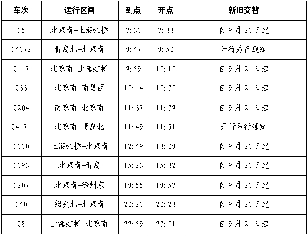 增开列车11列高铁列车,包括:G5北京南-上海虹桥、G4172青岛北-北京南、G117北京南-上海虹桥、G33北京南-南昌西、G204南京南-北京南。