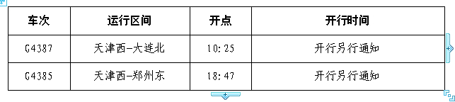 增开列车2列,分别为:G4387天津西-大连北、G4385天津西-郑州东;