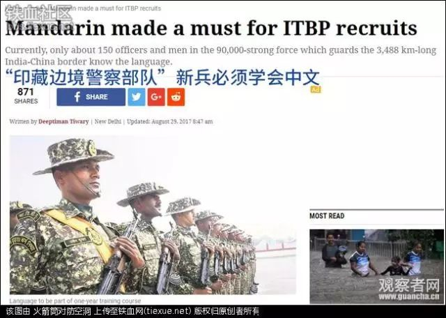 是的,你没看错。据《印度快报》报道,洞朗对峙后,印度“印藏边境警察部队”(ITBP)决定,新兵必须学会流利的中文,包括普通话和藏语。