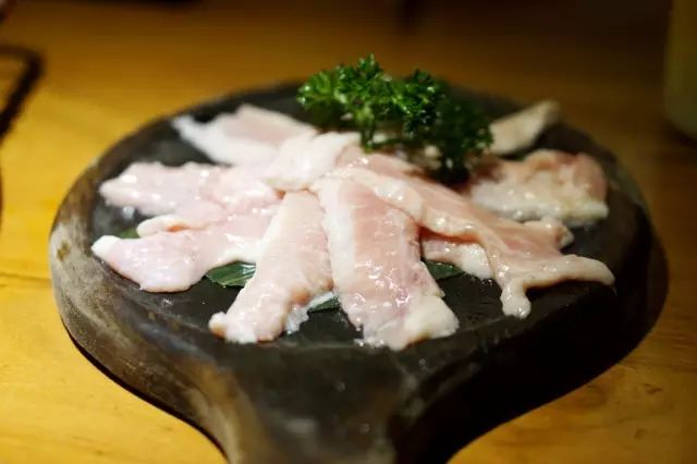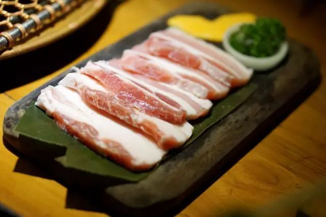 焱石的猪肉选用的是排酸猪肉,每个部位都经过挑选。烤猪肉时,最好烤至全熟表面微焦,建议搭配包肉酱或干料;用生菜或者苏子叶包住食用,也可一同放蒜片、辣椒圈或者各种泡菜。