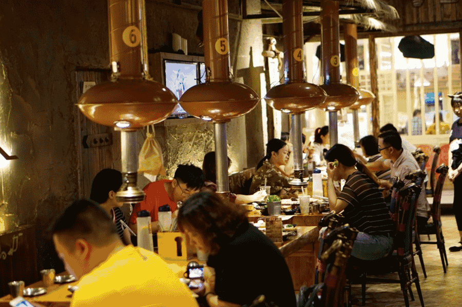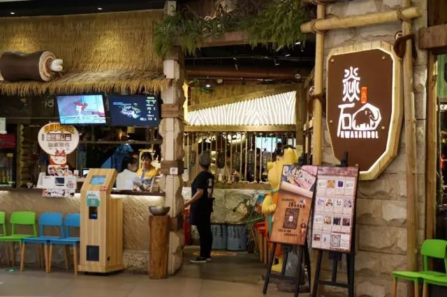 一炉果木炭,一个纯铜篦,几盘五花肉下肚,夏天热的苦,秋来烤肉补。混沌开天地时,人类学会了使用火,我们才拥有了最初的美食与感动。焱石烤肉的出现就是为了回归到制造美味温情的原点,找回记忆中入口的那一抹纯粹的滋味。草棚屋顶、树枝造型的吊灯,走道两侧以草绳和木桩装饰,石墙上绘有电影《疯狂原始人》的漫画,各式原始图腾标识上墙,石器时代的粗犷画风迎面而来。不只是口味上的原始感动,焱石烤肉在装修上也极具“原始感”。