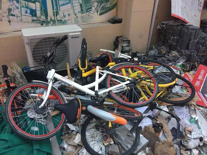 飞越广场附近共享单车被扔在了垃圾堆里