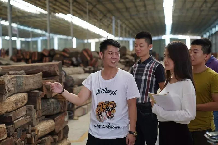 胜北集团总经理陈明伟先生带领记者团队参观名贵木头交易市场