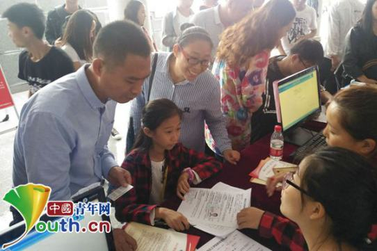 ↑张易文在父母的陪护下办理入学手续。受访者供图